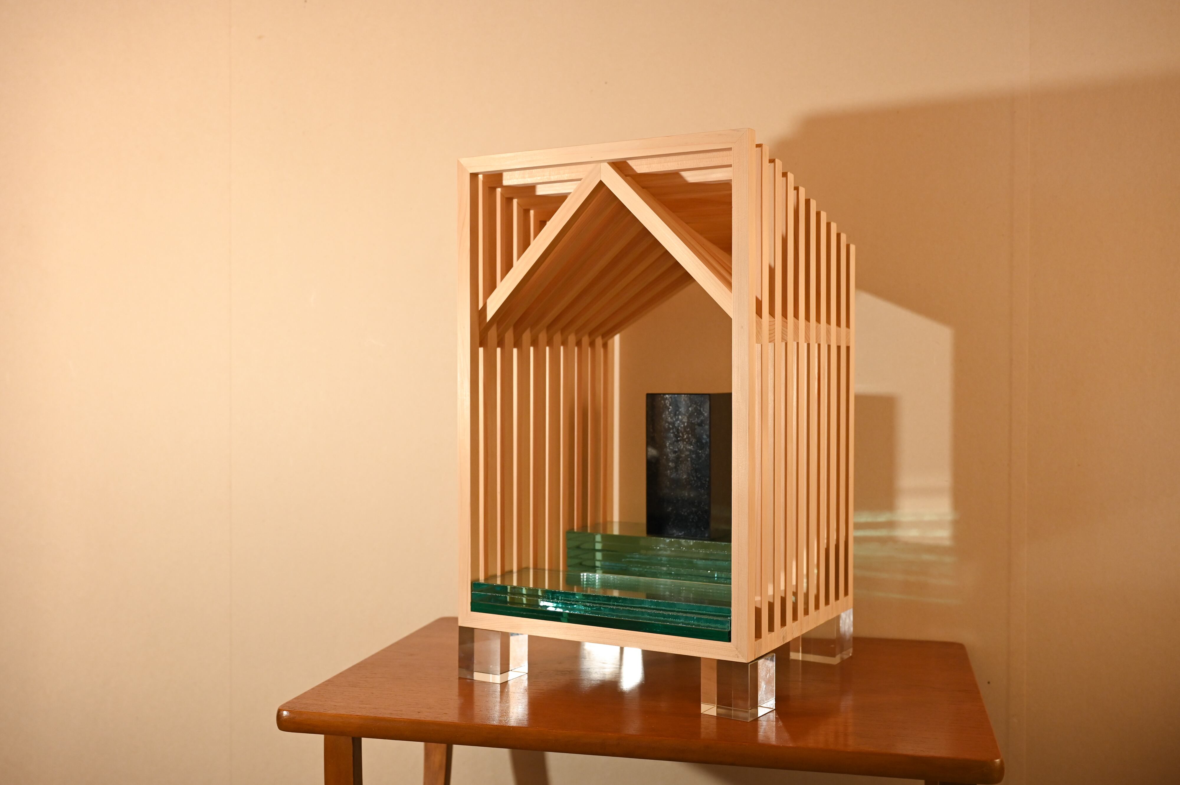 - 素材:ヒノキ角材、ガラス、透明アクリルキューブ